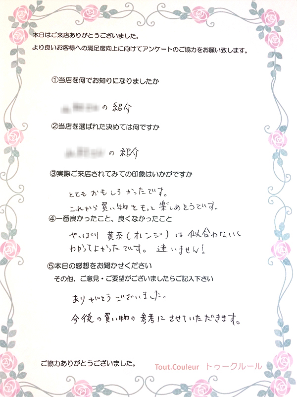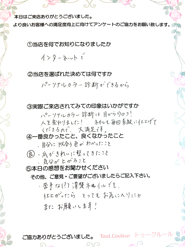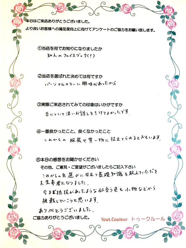 ①当社を何でお知りになりましたか知人のフェイスブック(?) ②当店を選ばれた決めては何ですかパーソナルカラーに興味があったから ③実際ご来店されてみての印象はい…