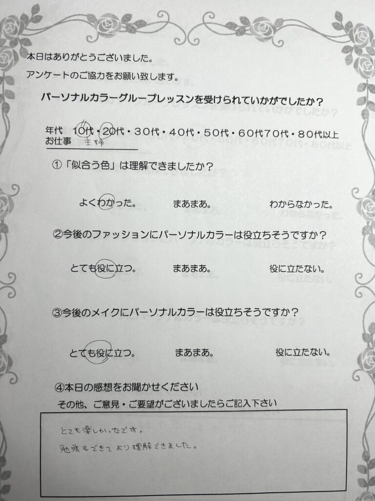 参加者の皆さんからは、満足度の高い声が多く寄せられました。パーソナルカラーの魅力がしっかり伝わっていることがわかります。次回のレッスンも楽しみにしていただけるよう、さらに内容を充実させてまいります!